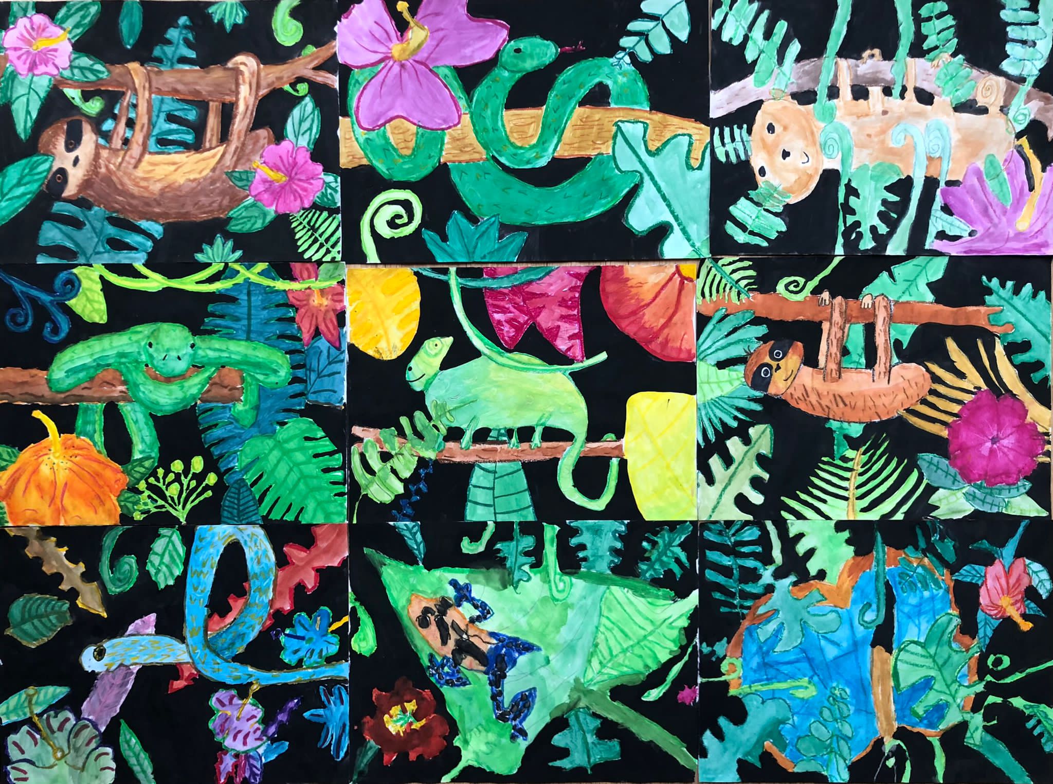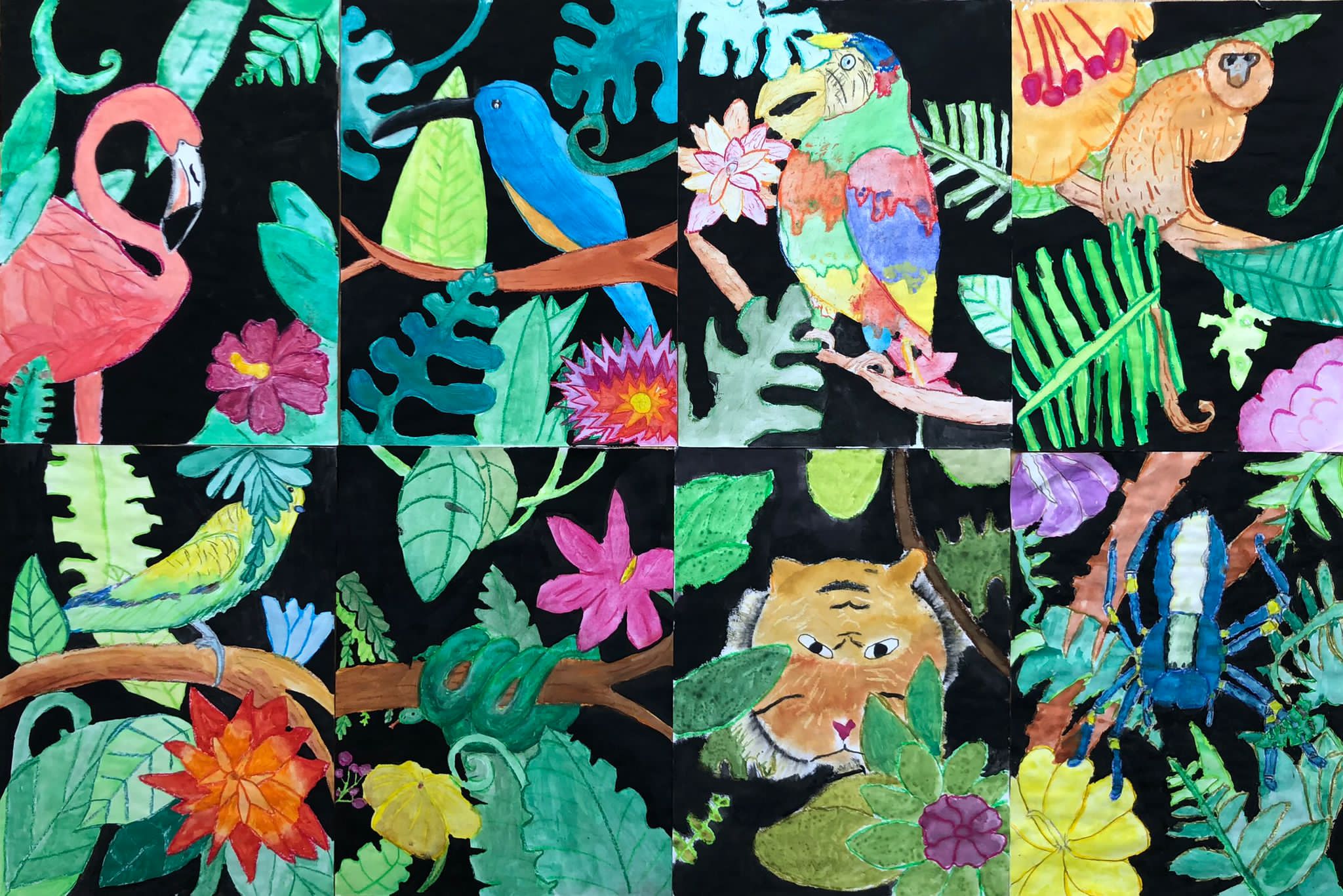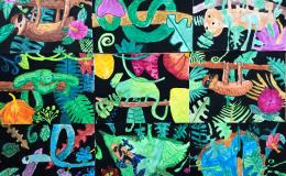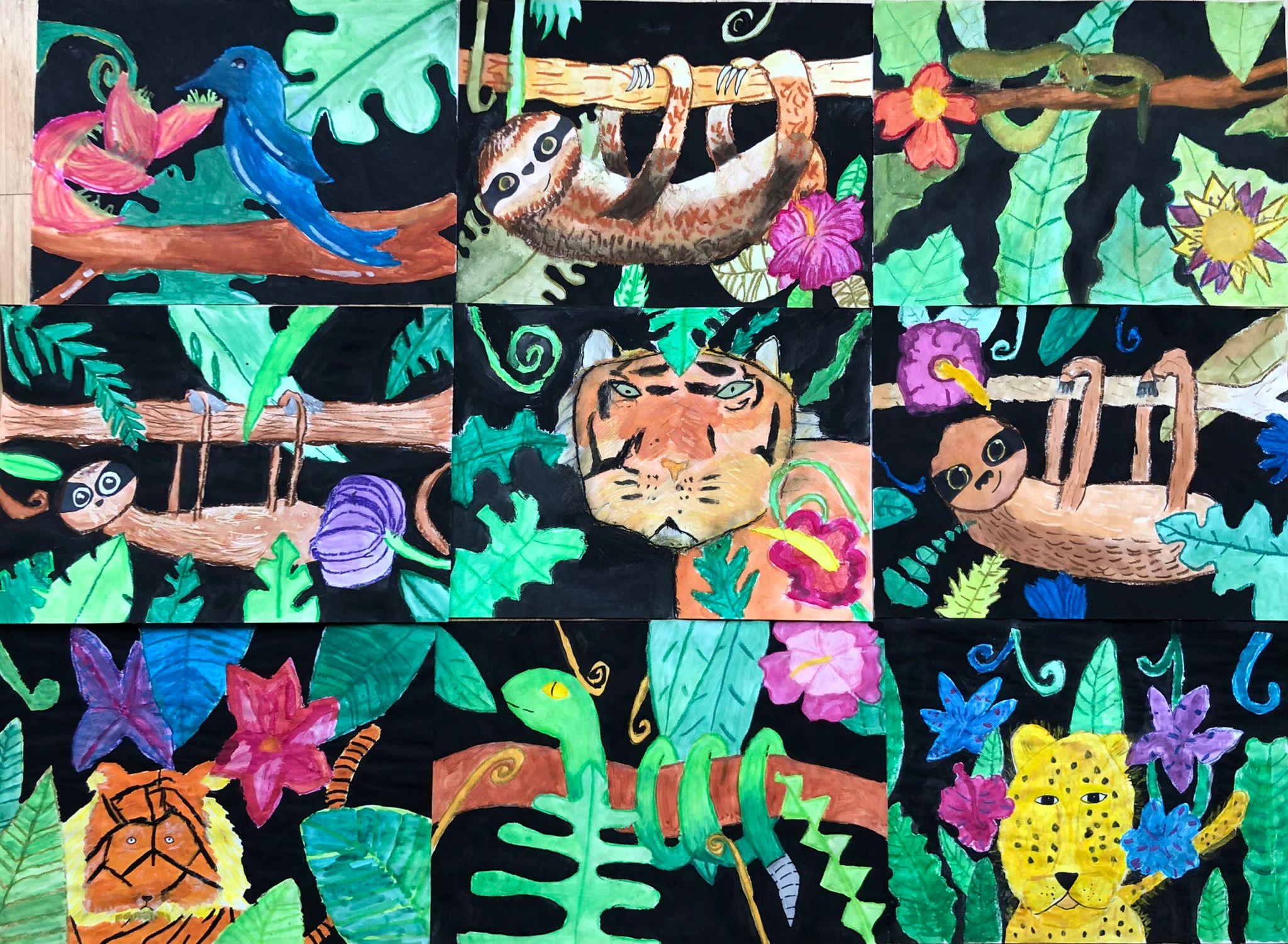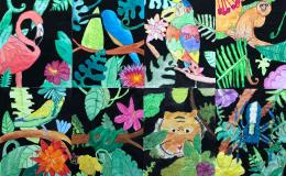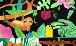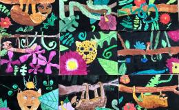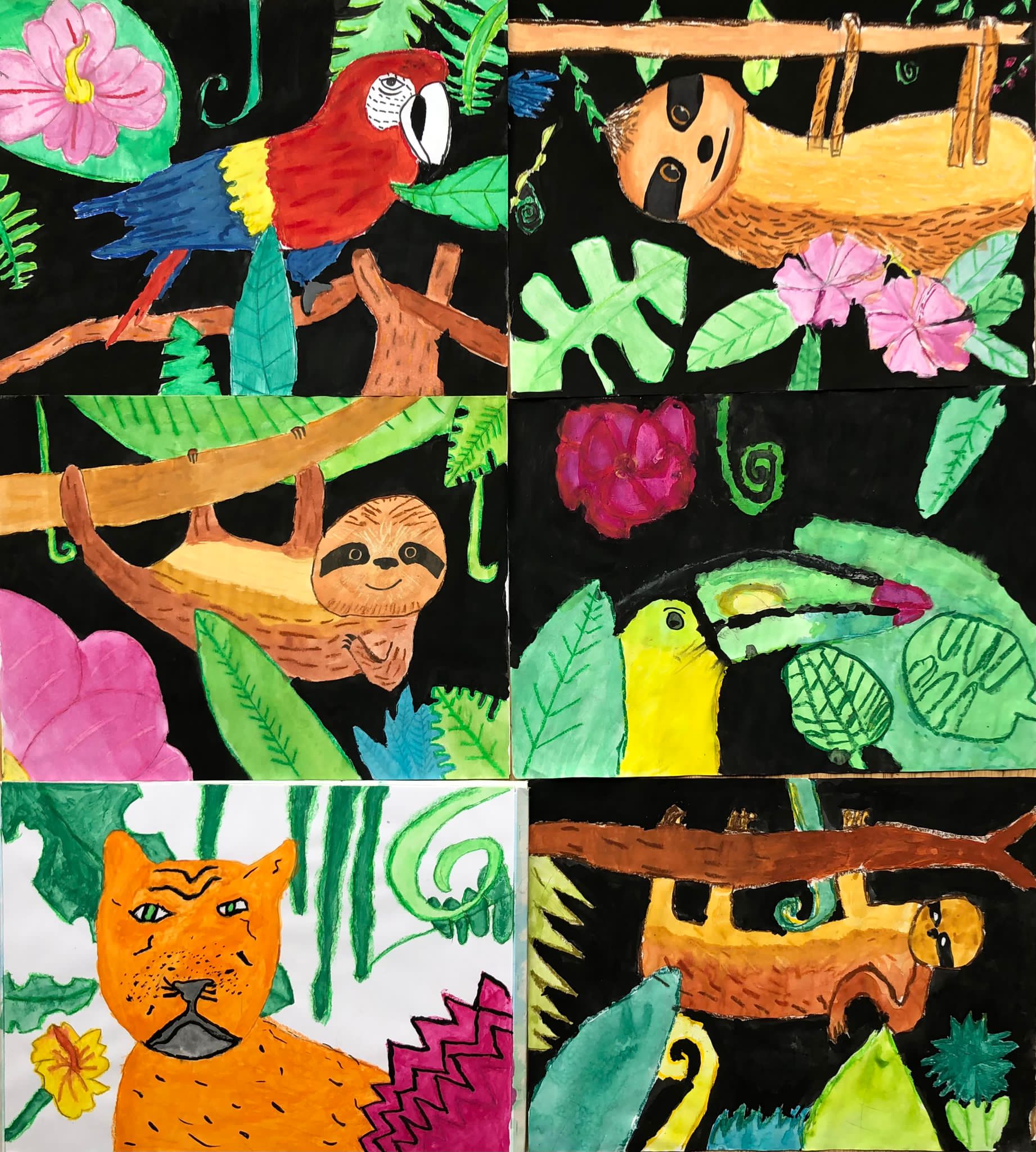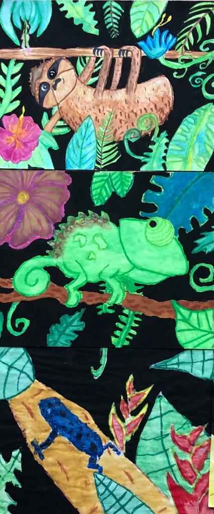 Leider hatten wir bei unserer Exkursion unsere Kamera vergessen. Na sowas. Gut, dass wir uns diese Eindrücke eingeprägt und wir im Dschungelshop sogar noch ein paar nette Postkarten gekauft hatten. Also her mit Bleistift, Pastellkreiden und Wasserfarben, Skizze angelegt und dann das große Papier ausgepackt. Bei der Planung haben wir darauf geachtet, dass unser Bild in Vorder-, Mittel- und Hintergrund aufgeteilt ist, um unserem Urwaldbild Tiefe zu verleihen. Eine Urwaldblüte war natürlich auch unbedingt notwendig, sowie viele Urwaldblätter, hinter dem sich das Lieblingsurwaldtier verstecken konnte… sofern es denn wollte. Alle Farben wurden angemischt und unterschiedlich deckend aufgetragen, um mit der Wirkung der Pastellkreiden experimentieren zu können. Die Pastellkreide haben wir zuerst aufgetragen, ehe wir mit den Wasserfarben die Flächen ausgemalt haben. Dadurch haben unsere Tiere eine schönere Fell-, Feder- und Schuppenstruktur bekommen. Bei einigen Werken lässt sich auch schon etwas Licht- und Schattenspiel erkennen.