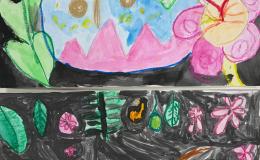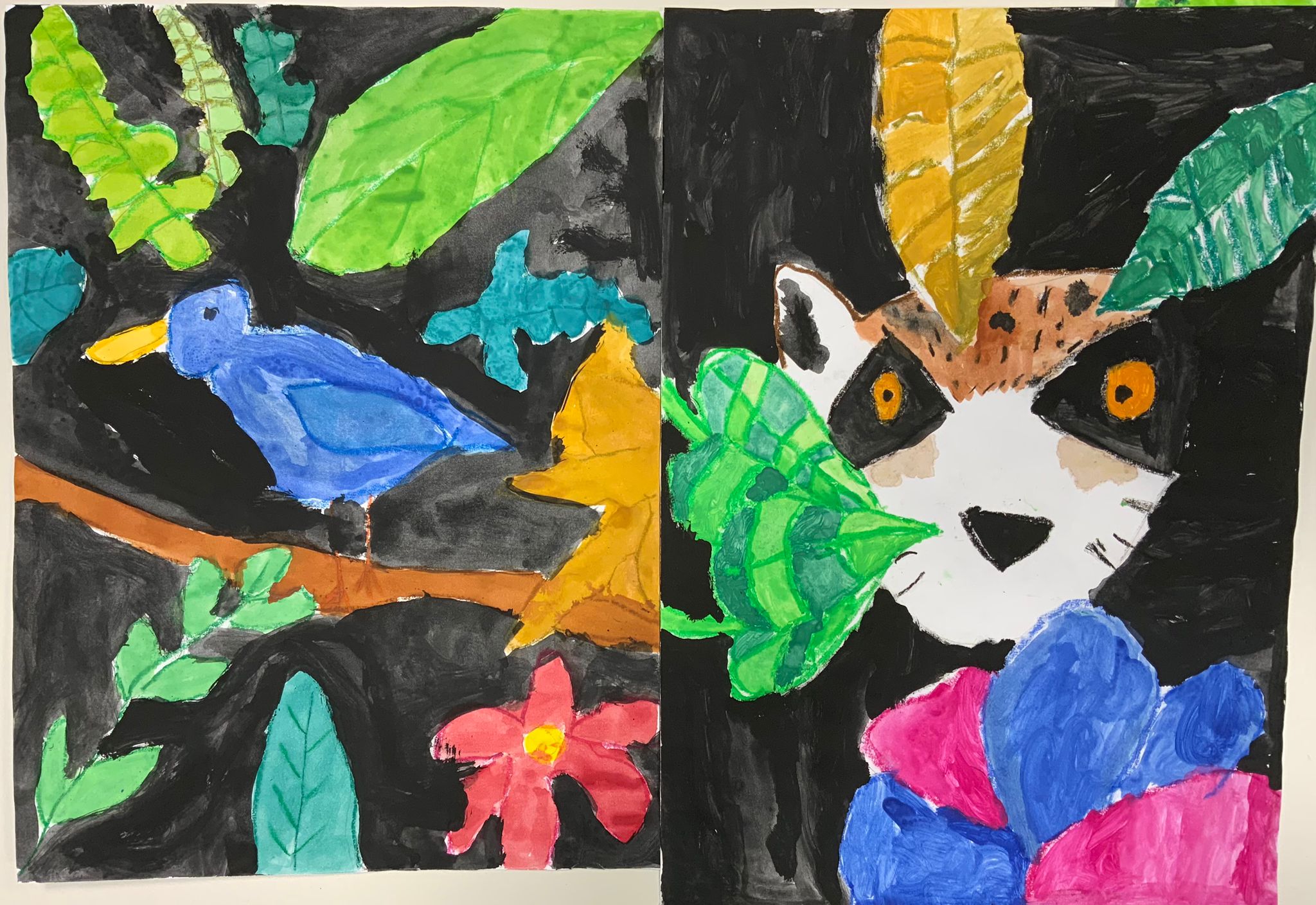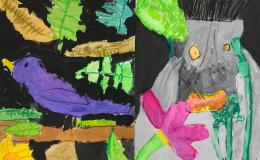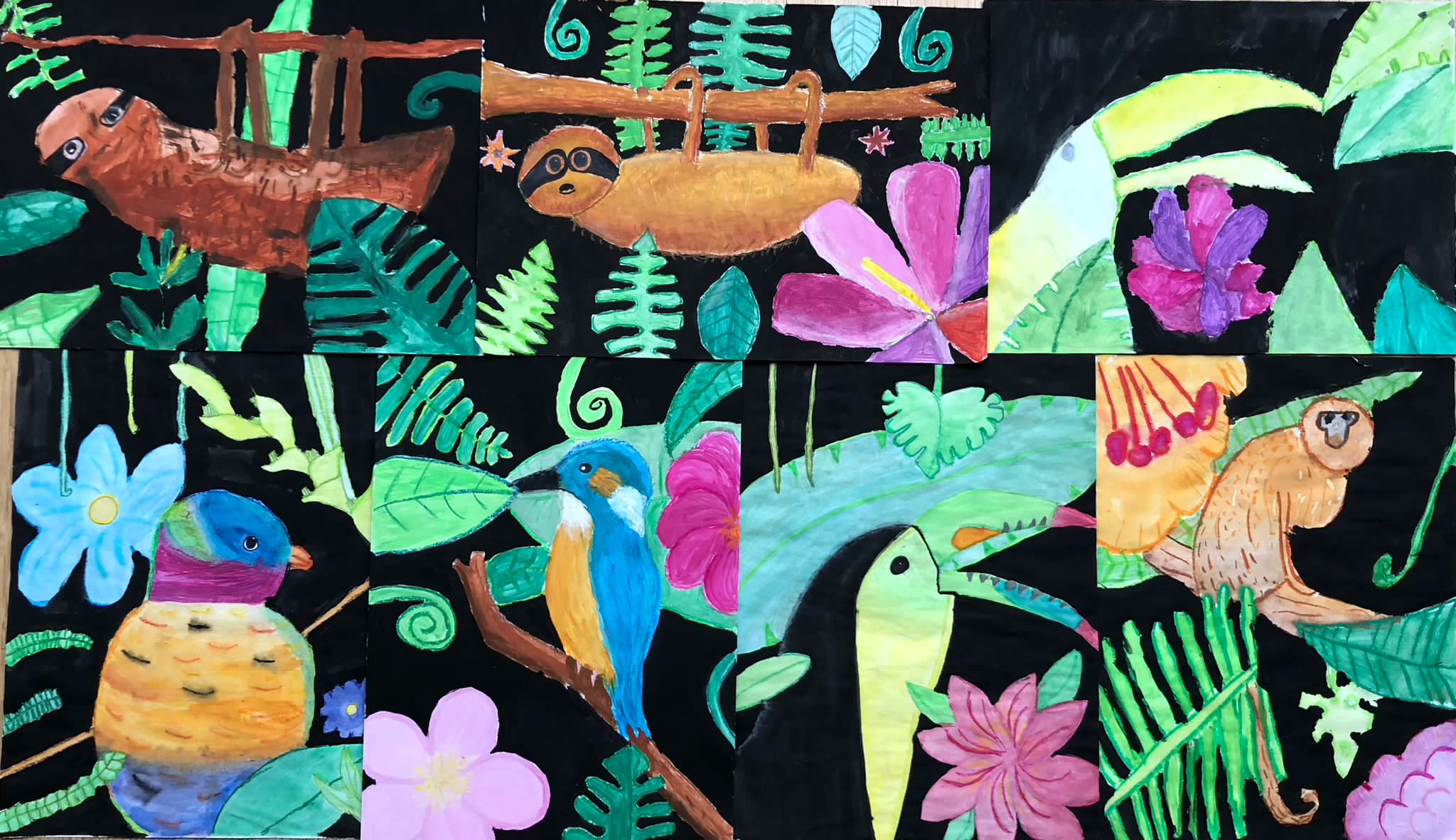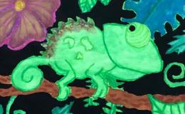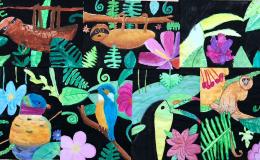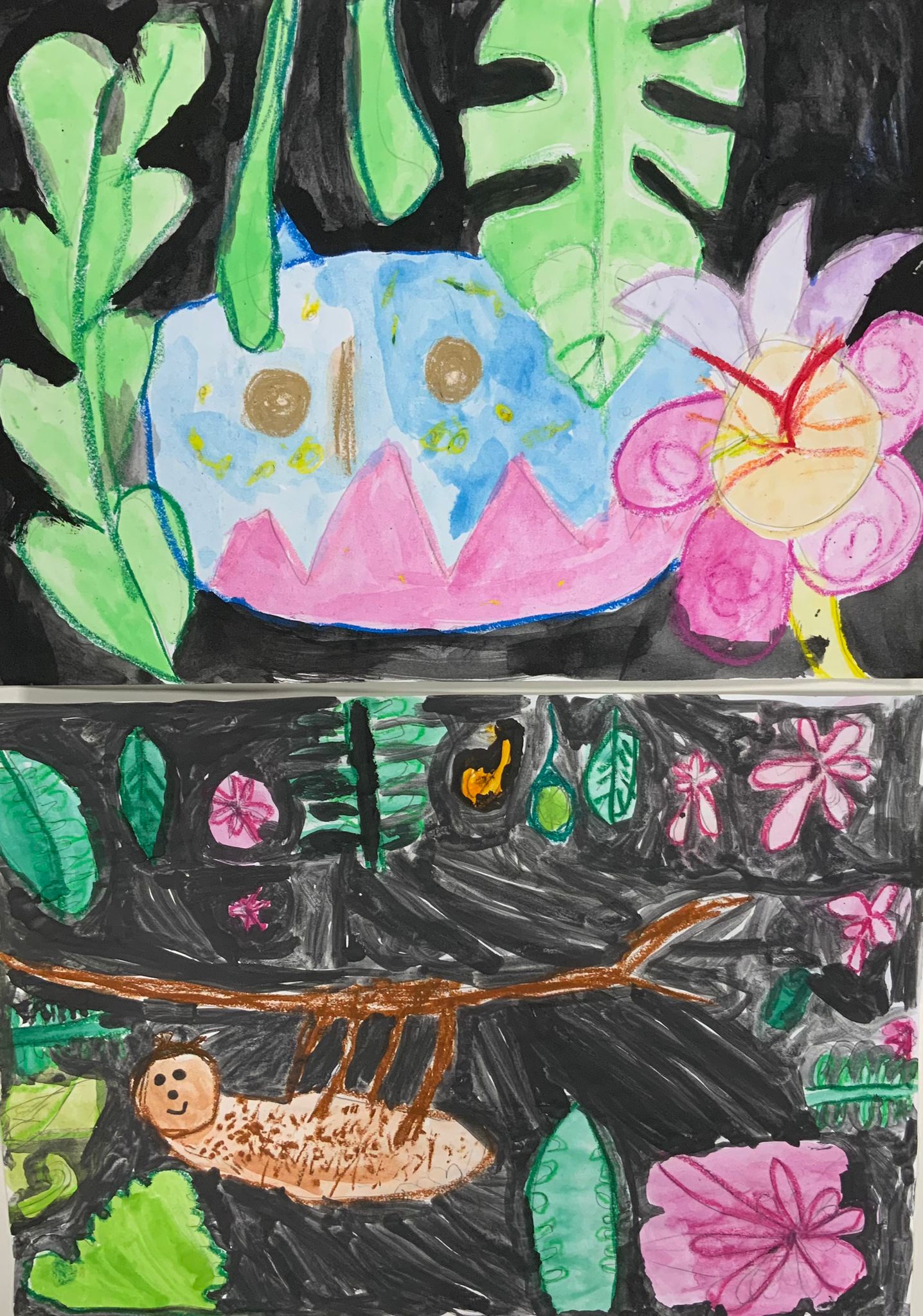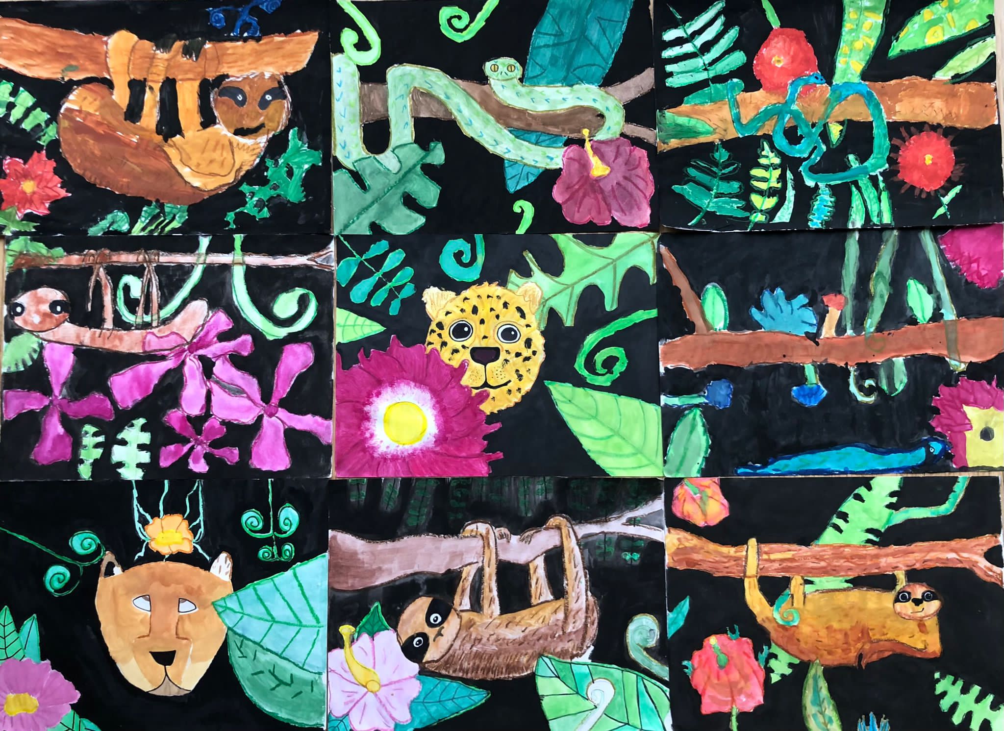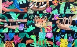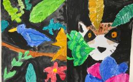 Leider hatten wir bei unserer Exkursion unsere Kamera vergessen. Na sowas. Gut, dass wir uns diese Eindrücke eingeprägt und wir im Dschungelshop sogar noch ein paar nette Postkarten gekauft hatten. Also her mit Bleistift, Pastellkreiden und Wasserfarben, Skizze angelegt und dann das große Papier ausgepackt. Bei der Planung haben wir darauf geachtet, dass unser Bild in Vorder-, Mittel- und Hintergrund aufgeteilt ist, um unserem Urwaldbild Tiefe zu verleihen. Eine Urwaldblüte war natürlich auch unbedingt notwendig, sowie viele Urwaldblätter, hinter dem sich das Lieblingsurwaldtier verstecken konnte… sofern es denn wollte. Alle Farben wurden angemischt und unterschiedlich deckend aufgetragen, um mit der Wirkung der Pastellkreiden experimentieren zu können. Die Pastellkreide haben wir zuerst aufgetragen, ehe wir mit den Wasserfarben die Flächen ausgemalt haben. Dadurch haben unsere Tiere eine schönere Fell-, Feder- und Schuppenstruktur bekommen. Bei einigen Werken lässt sich auch schon etwas Licht- und Schattenspiel erkennen.