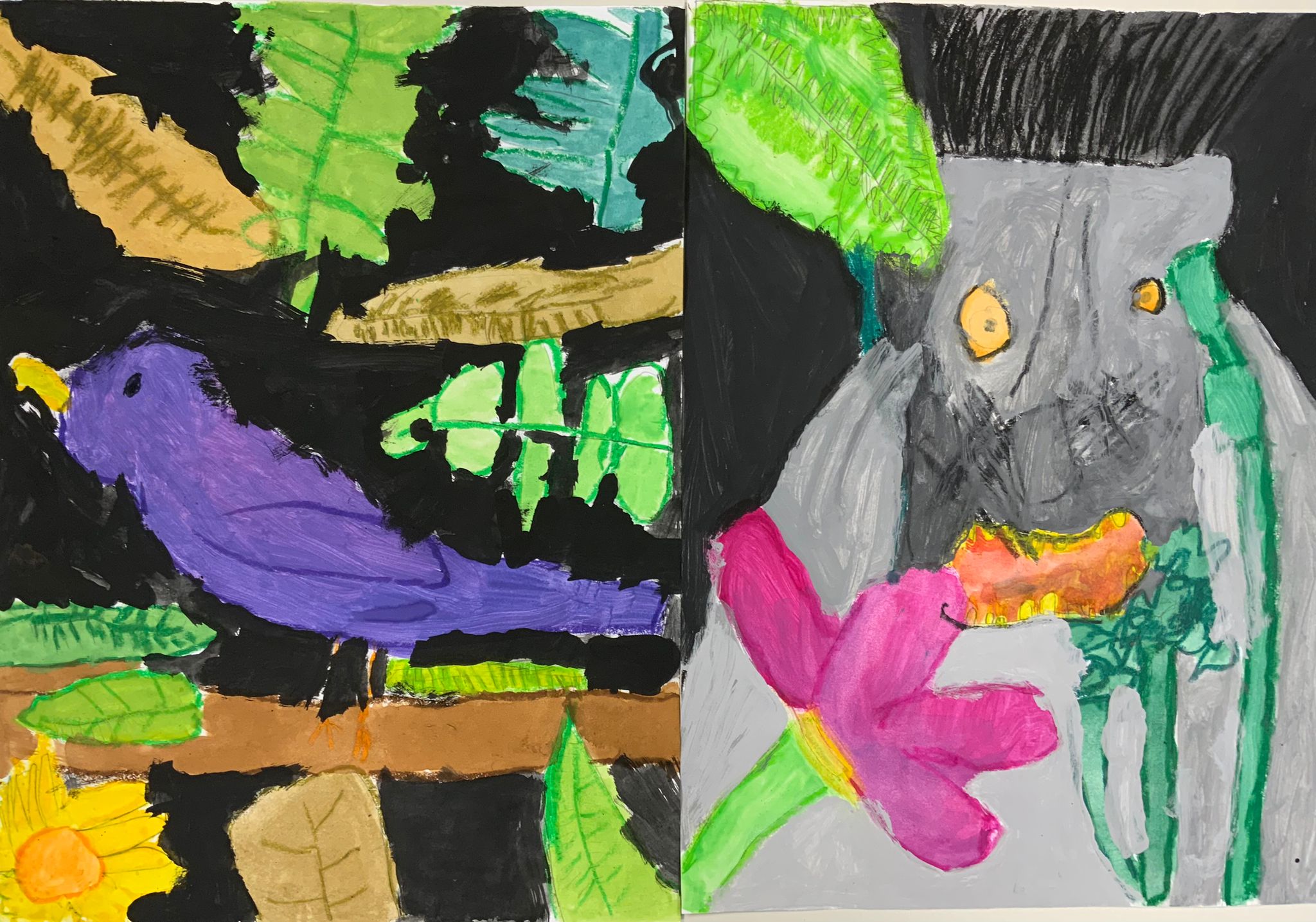 Da waren herrlich große, farbenprächtige exotische Blüten direkt vor unserer Nase im Vordergrund und mit dem Lupenblick haben wir festgestellt, dass diese Blüten unterschiedlichste Farbtöne zeigen können. Etwas weiter weg - hinter Blüten und Blättern versteckt - haben wir Tiere lauern, hängen, hocken, schlängeln und krabbeln gesehen. Und wer ganz genau hinschaute, erkannte sogar die Wuchsrichtung von Fell, Federn und Schuppen. Im Hintergrund waren ebenfalls noch Lianen und ein paar große Urwaldblätter zu erspähen, gefächert, gerollt und riesengroß mit Blattrissen und Blattadern. Prächtig!